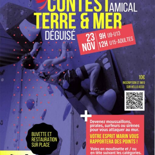 Vous l’attendiez avec impatience, l’ALJ l’a fait ! THEME DE L’ANNEE : Terre et Mer ! Le dimanche 23 novembre 2025 se tiendra le Contest Annuel du club de JONAGE ! Venez découvrir nos voies ouvertes du 4a au 8b pour l’occasion et éprouver vos talents de grimpeur dans la bonne humeur et la convivialité qui nous sont si chères. Enfants et adultes, de 6 à 99 ans (classés ou non), nous vous attendons pour profiter d’une journée de grimpe.